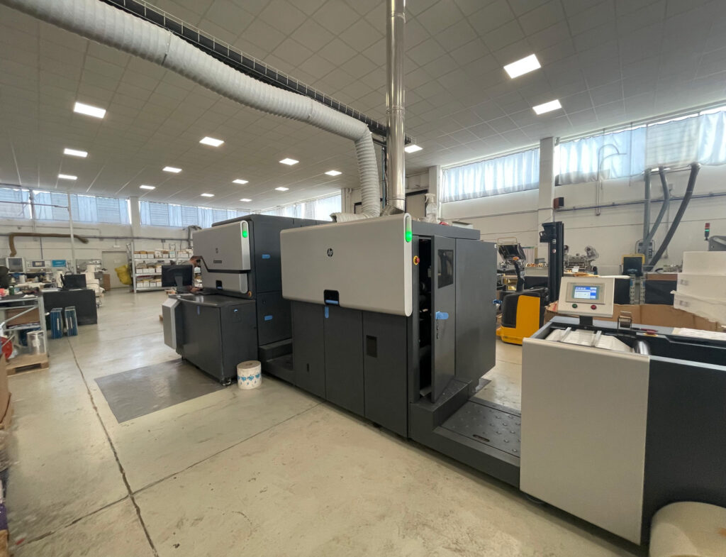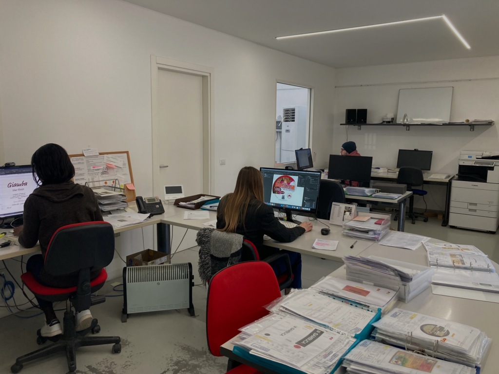 Il reparto produttivo è composto da sei operatori, ognuno specializzato per la propria fase della catena produttiva. Stampiamo in lito-digitale grazie alla nostra stampante HPWS 6900 INDIGO